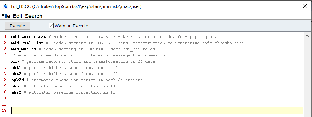 When working with NUS data, there are ‘holes’ in the data – it needs a special kind of reconstruction. Since Topspin 3.5pl6, there are reconstruction algorithms that are provided for use without a special license. However, if you’ve been processing NUS data, and have seen a little error message that pops up telling you only have access to the free reconstruction techniques, we can get rid of that in our macro.