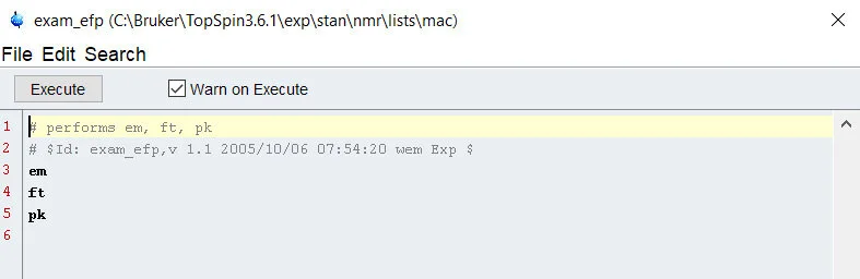 First, you have to open up the Macro menu in Tospin by typing the command “edmac”. This launches the Macro menu, likely populated with a lot of Bruker provided scripts that automate a large chunk of processing. First, lets look one of the provided examples, the example_efp macro – open this up by highlighting the script and selecting edit.