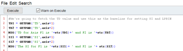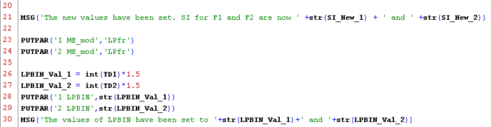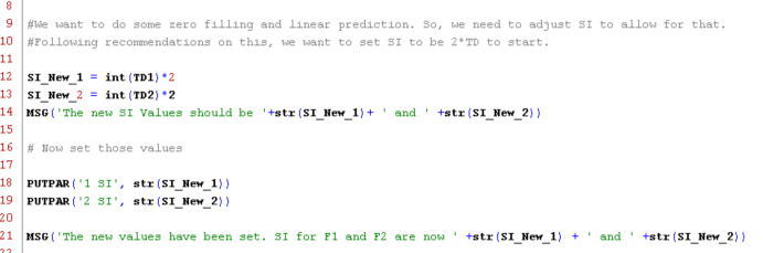 In this first chunk of code, we are simply retrieving the values for the parameter TD from the OPEN dataset. Next, we use a built in dialog box to send a message to the user about what those parameters actually are, and then do the same for SI. You may notice that I tell the script to convert the value of TD1 and TD2 to strings using the str() command. This is actually not required, since the GETPAR( ) function returns values as strings, but I choose to force the hand.