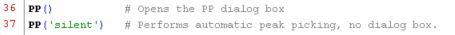 After this, we have our new spectrum returned with linear prediction and zero filling performed. We could end there, but there is one more feature that you might like to know about. Using the built in functions, some of them can be passed variables or commands that alter the way the function is performed. Take, for instance, peak picking. If we were using this script to do automatic peak picking on the spectrum, the last thing we want is to have the peak picking dialog box pop up for each of our 100 samples - so we' disable the pop up box by instead opting for the silent mode of peak picking.